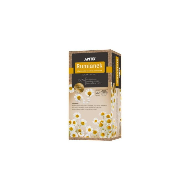 wysuszony i rozdrobniony koszyczek rumianku pospolitego (Chamomilla recutita L.) 100 %. 1,5 g 3 g