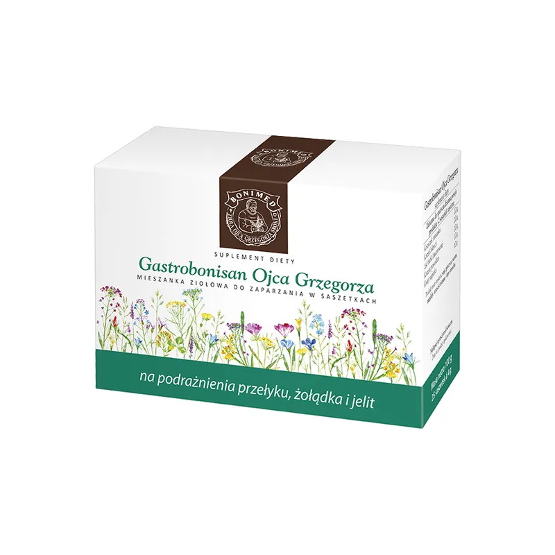 Gastrobonisan Ojca Grzegorza - suplement diety zawierający mieszankę ziół wspomagający przy podrażnieniu przełyku, żołądka i jelit. Produkt przeznaczony dla osób dorosłych.