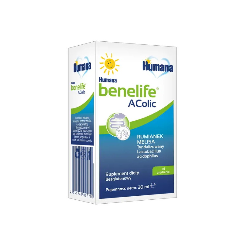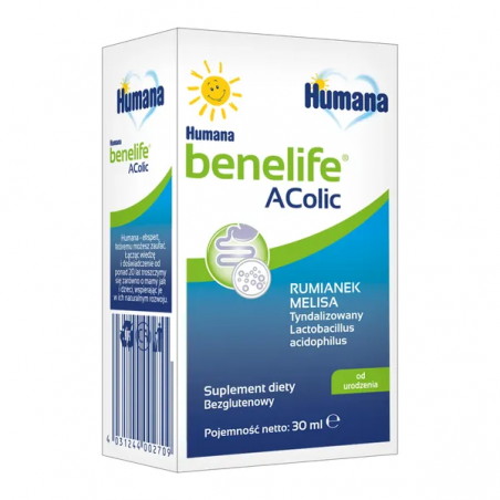Humana benelife AColic - suplement diety zawierający ekstrakt z kwiatów rumianku i liści melisy, a także bakterie kwasu mlekowego. Produkt przeznaczony dla niemowląt od urodzenia, u których występują kolki jelitowe i zaburzenia czynności przewodu pokarmowego.
