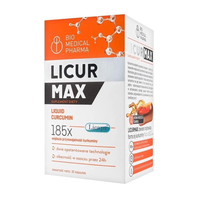 Licur Max to zaawansowany suplement diety zawierający micelarną kurkuminę NovaSOL®, pozyskiwaną z kłącza kurkumy (Curcuma longa L.). Dzięki innowacyjnej formule micelarnej, kurkumina w Licur Max wchłania się 185 razy lepiej niż standardowe ekstrakty i utrzymuje się w osoczu krwi przez 24 godziny, co zapewnia długotrwałe działanie.