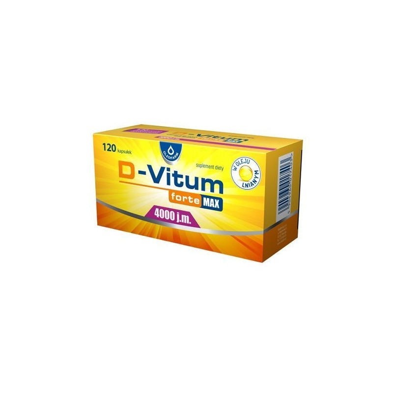 Suplement diety w postaci kapsułek o wysokiej zawartości witaminy D, która została rozpuszczona w oleju z nasion lnu. Każda kapsułka preparatu D-Vitum Forte Max 4000 j.m dostarcza 100 µg witaminy D, co stanowi 2000% dziennej zalecanej wartości spożycia dla osoby dorosłej. Witamina D, bierze udział w wielu procesach zachodzących w organizmie. Pomaga w: