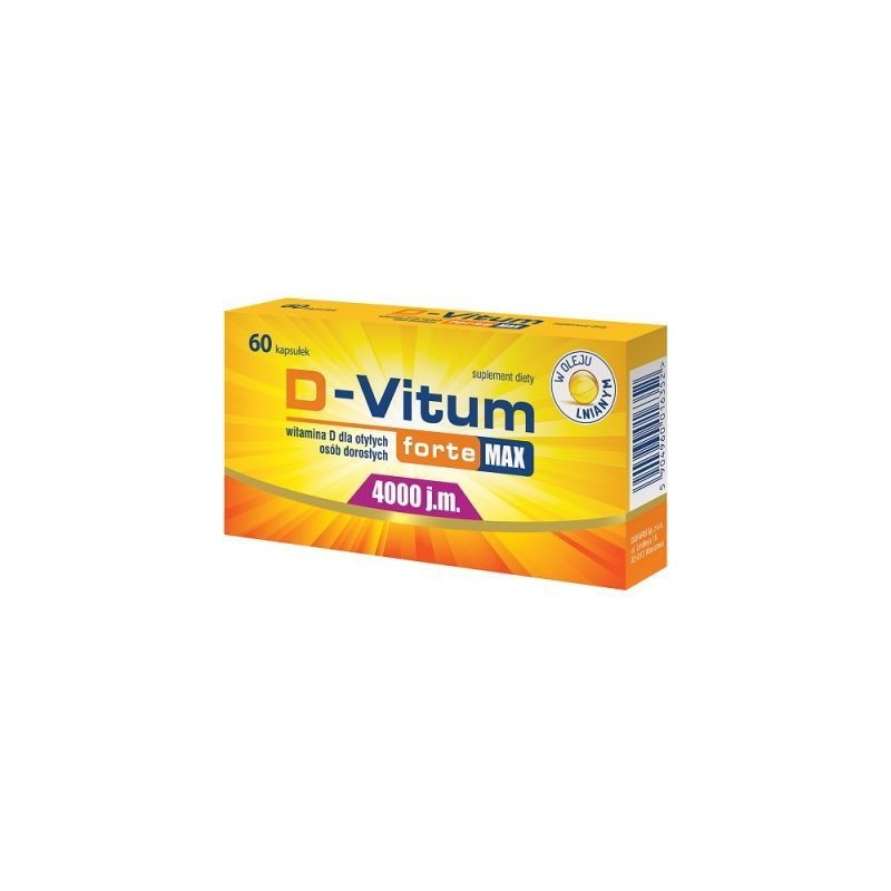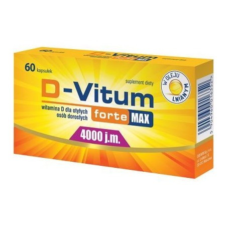 Suplement diety w postaci kapsułek o wysokiej zawartości witaminy D, która została rozpuszczona w oleju z nasion lnu. Każda kapsułka preparatu D-Vitum Forte Max 4000 j.m dostarcza 100 µg witaminy D, co stanowi 2000% dziennej zalecanej wartości spożycia dla osoby dorosłej. Witamina D, bierze udział w wielu procesach zachodzących w organizmie. Pomaga w: