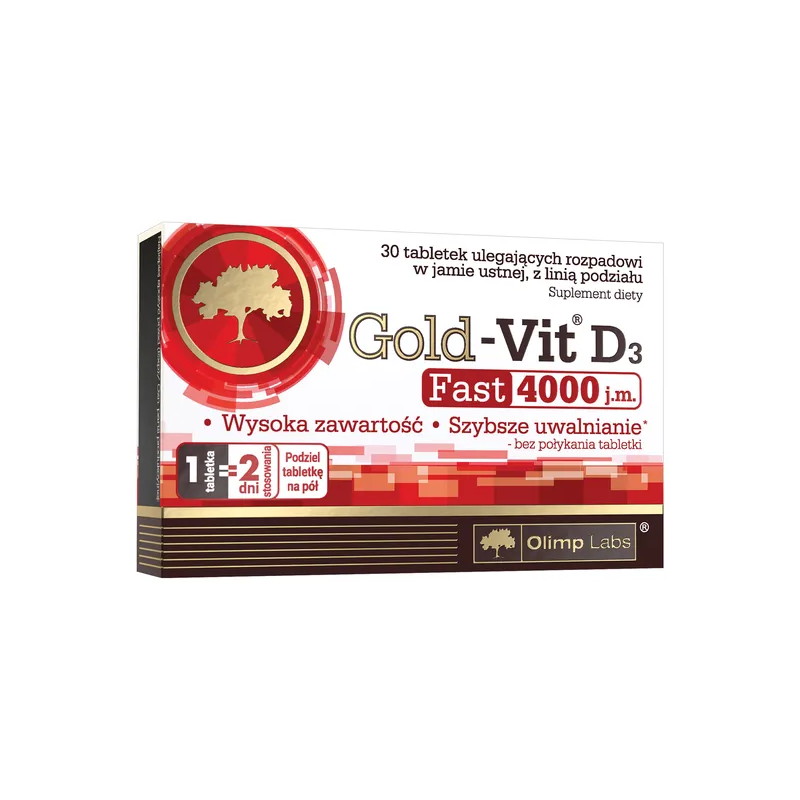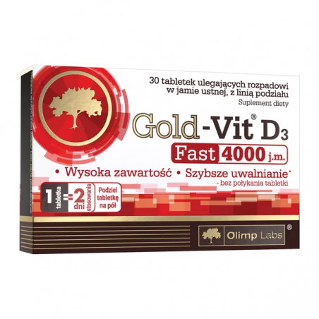 Olimp Gold-Vit D3 Fast - suplement diety zawierający w swoim składzie witaminę D (cholekalcyferol) w wygodnej formie tabletki ODT czyli rozpadającej się w jamie ustnej. Produkt przeznaczony dla osób dorosłych.