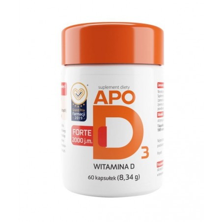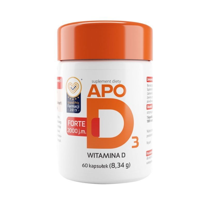ApoD3 Forte 2000 j.m. to suplement diety wskazany do stosowania w celu uzupełnienia codziennej diety w witaminę D3. Przeznaczony dla osób dorosłych, seniorów (60+), dzieci i młodzieży między 6. a 18. rokiem życia ze zwiększoną masą ciała oraz dla kobiet w ciąży i karmiących piersią.