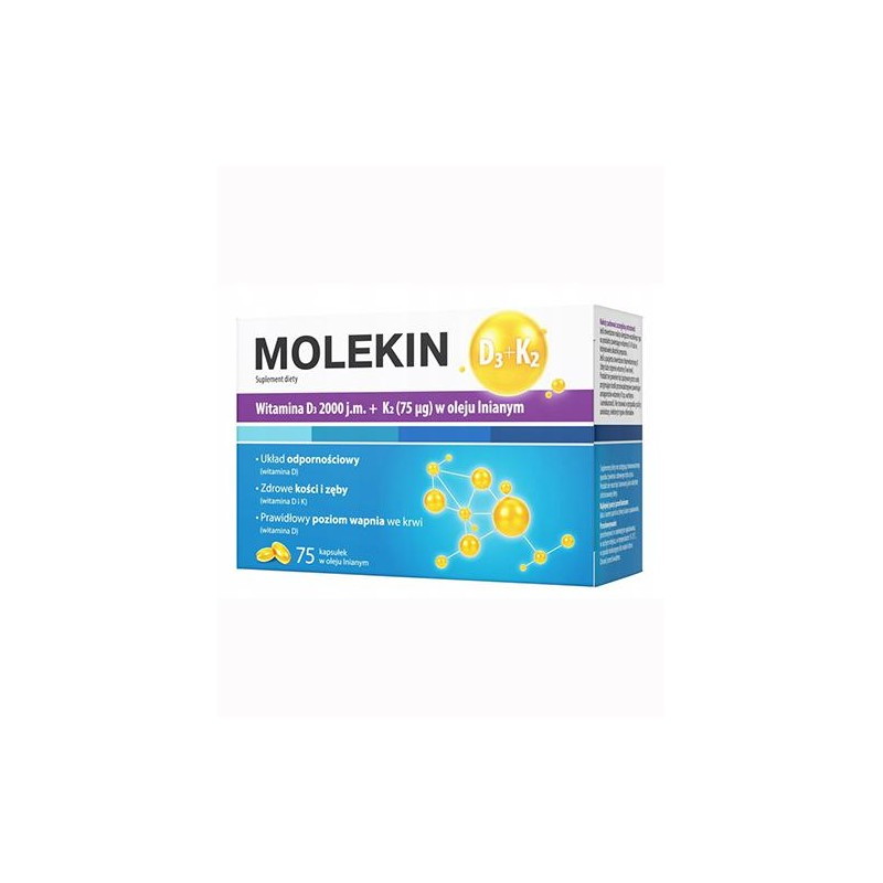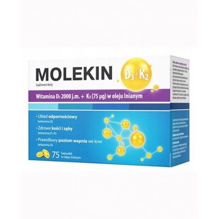 Molekin D3+K2 w oleju lnianym to suplement diety zawierający 2000 IU witaminy D3 oraz 75 mcg witaminy K2 w 1 kapsułce.