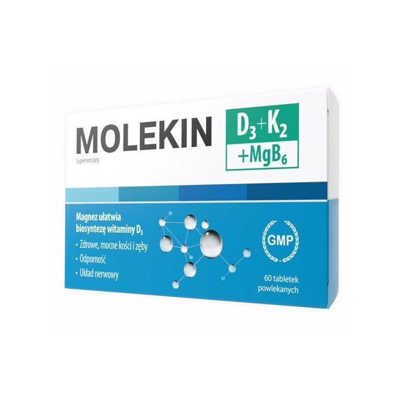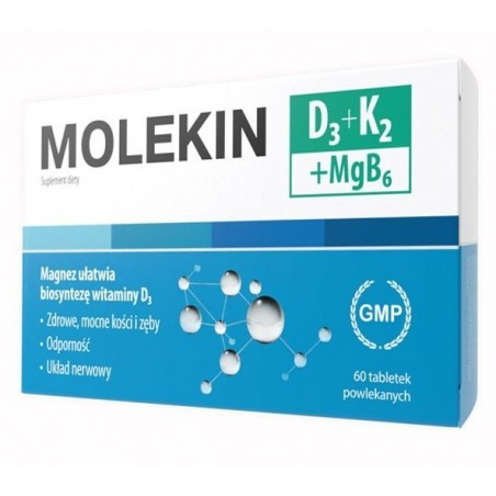 Produkt Molekin D3+K2+Mgb6 tabletki powlekane (60 sztuk) to suplement diety przeznaczony dla osób dorosłych.