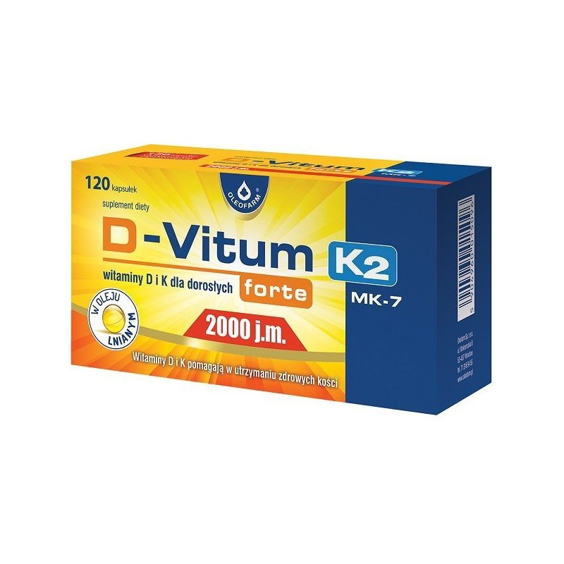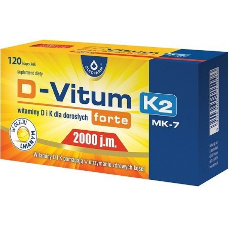 Witaminy D i K pomagają w utrzymaniu zdrowych kości. Tkanka kostna jest dynamiczną strukturą, która nieustannie podlega procesom przebudowy. Niektóre komórki kostne (osteoklasty) rozkładają tkankę kostną uwalniając wapń, a inne (osteoblasty) tworzą nową tkankę kostną poprzez wbudowywanie m.in. wapnia do kości. Ważne jest zachowanie równowagi pomiędzy tymi dwoma procesami, szczególnie dlatego, że wraz z wiekiem następuje nasilenie procesu rozkładu tkanki kostnej. Zapewnienie równowagi metabolizmu kości jest możliwe poprzez uzupełnianie z dietą odpowiednich składników. Witamina D pomaga w utrzymaniu zdrowych kości i zębów, a także w prawidłowym wchłanianiu i wykorzystywaniu wapnia i fosforu. Ponadto pomaga w utrzymaniu prawidłowego poziomu wapnia we krwi i bierze udział w procesie podziału komórek. Witamina D wspiera również prawidłowe funkcjonowanie mięśni. Witamina K, podobnie jak witamina D, pomaga w utrzymaniu zdrowych kości. Organizm człowieka nie jest w stanie samodzielnie syntetyzować witaminy K2, w związku z czym zapotrzebowanie na tą witaminę pokrywane jest głównie z dietą oraz w mniejszym stopniu dzięki syntezie prowadzonej przez bakterie jelitowe. Preparat D-Vitum forte 2000 j.m. K2 zawiera w swoim składzie witaminę K2 – menachinon-7 (MK-7). Ma to istotne znaczenie, ponieważ właśnie ta forma chemiczna witaminy K bierze udział w metabolizmie kostnym.