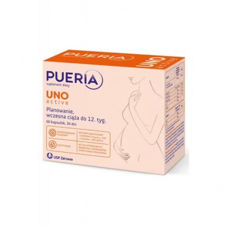 Pueria Uno Active - to suplement diety w postaci 2 rodzajów kapsułek: z witaminami i minerałami oraz z kwasem DHA. Produkt przeznaczony dla kobiet planujących ciążę oraz we wczesnej ciąży do końca 12. tygodnia.