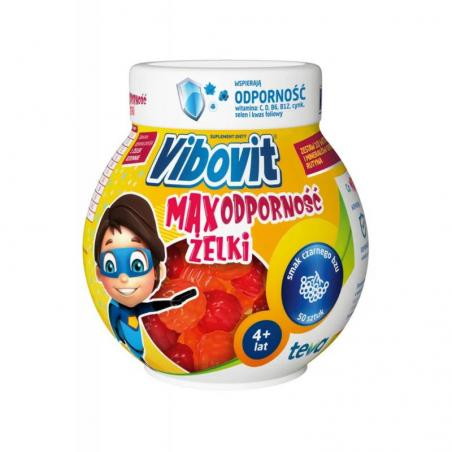 Vibovit Max Odporność Żelki - to suplement diety w formie żelek, który w swoim składzie zawiera witaminy i minerały. Produkt przeznaczony dla dzieci powyżej 4. roku życia.