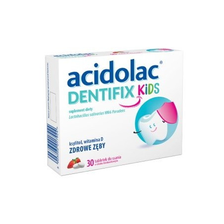 Acidolac Dentifix Kids - suplement diety zawierający składniki wspomagające zdrowe zęby. Produkt przeznaczony dla dzieci powyżej 3 roku życia.