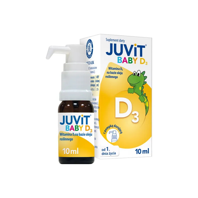 Juvit Baby D3 zawiera witaminę D3 w płynie na bazie oleju roślinnego do stosowania dla dzieci i niemowląt już od pierwszych dni życia. Dzienna porcja produktu dla niemowląt do 6 miesiąca życia (2 naciśnięcia pompki) jest zgodna z rekomendowaną dla niemowląt dzienną dawką witaminy D3 wynoszącą 10 µg tj. 400 j.m. Suplement diety w kroplach zawiera witaminę D3 dla dzieci, która: