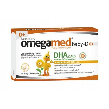 Omegamed Baby+D 0+ - suplement diety zapewniający codzienną porcję DHA oraz witaminy D. Produkt przeznaczony dla niemowląt i dzieci.