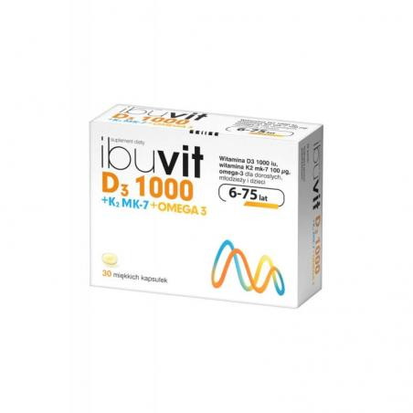 Ibuvit D3 1000+K2 MK-7 Omega-3 to suplement diety w kapsułkach, stworzony dla dzieci powyżej 6. roku życia, młodzieży i dorosłych. Łączy w sobie witaminę D dla zdrowych kości i odporności, witaminę K dla prawidłowego krzepnięcia krwi i zdrowia kości, oraz kwasy Omega-3 (DHA i EPA) wspierające pracę serca, mózgu i wzrok.