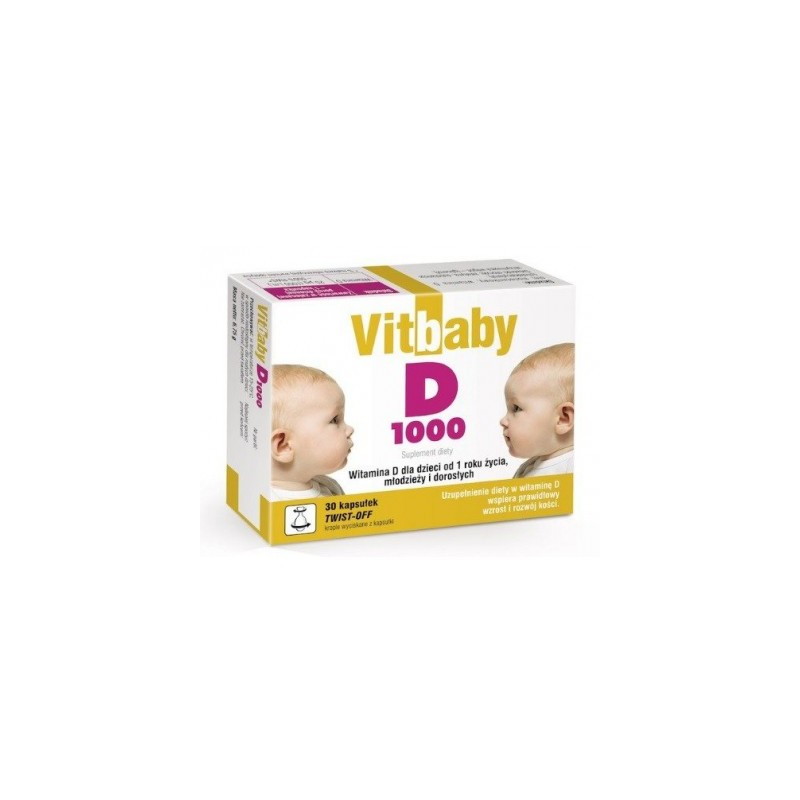 Vitbaby D 1000 - suplement diety zawierający w swoim składzie witaminę D. Produkt przeznaczony jest dla dzieci powyżej 1 roku życia, młodzieży oraz osób dorosłych.