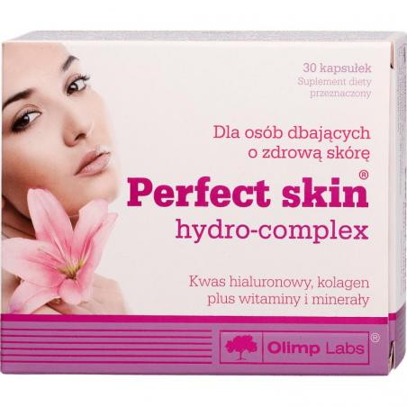 Olimp Labs Perfect Skin Hydro-Complex to suplement diety dla dorosłych, zawierający kolagen, kwas hialuronowy, ekstrakty roślinne (zielona herbata, pestki winogron), witaminy (A, C, E, biotyna) oraz minerały (cynk, miedź, mangan, selen). Składniki te wspierają zdrową skórę, prawidłową produkcję kolagenu, a także chronią komórki przed stresem oksydacyjnym i przyczyniają się do utrzymania prawidłowego stanu błon śluzowych.