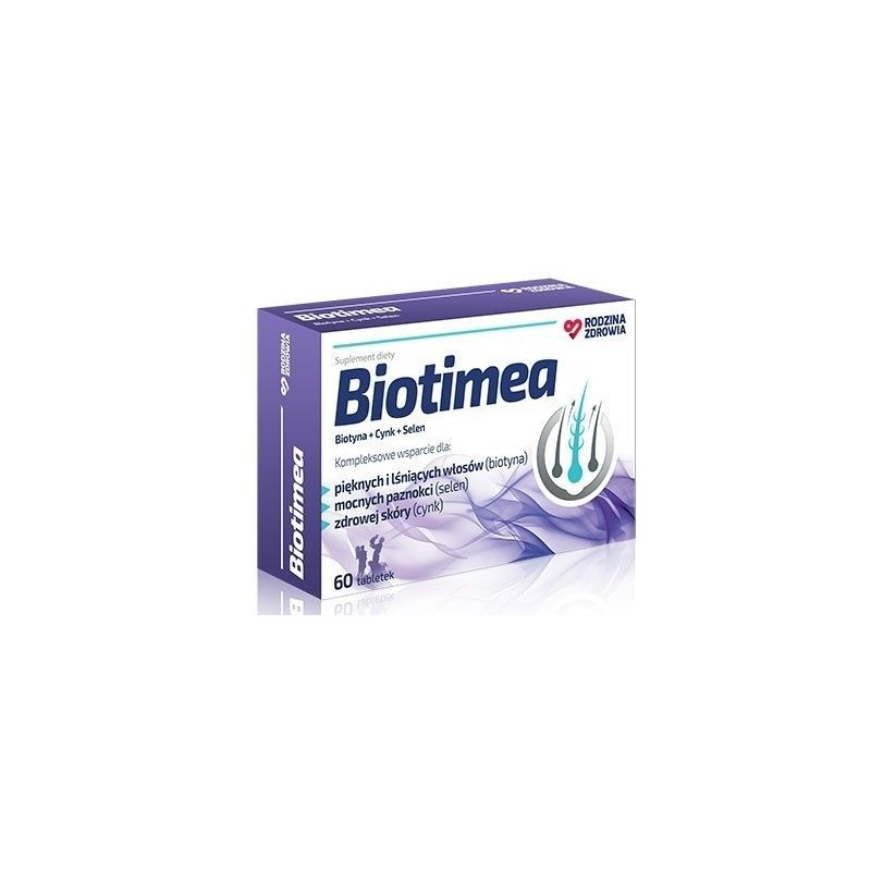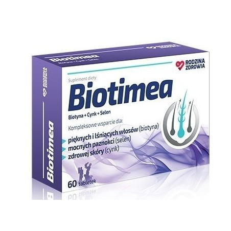 Suplement diety Rodzina Zdrowia Biotimea polecany jest osobom dorosłym w celu uzupełnienia codziennej diety w biotynę i dwa ważne składniki mineralne: cynk i selen, wpływające na utrzymanie prawidłowego stanu włosów.
