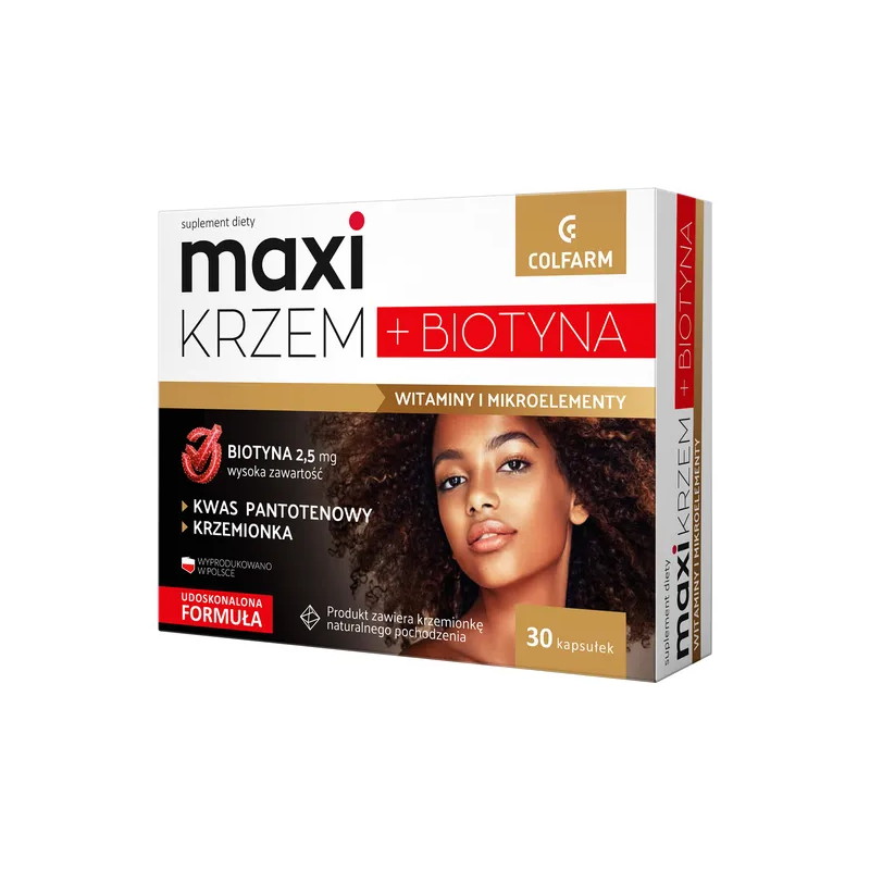 Maxi Krzem + Biotyna - suplement diety, który wspiera utrzymanie mocnych włosów. Produkt zawiera połączenie biotyny, krzemionki i kwasu pantotenowego z wyciągami ze skrzypu polnego i ziela pokrzywy, które wzmacniają włosy oraz paznokcie. Suplement diety przeznaczony dla osób dorosłych.