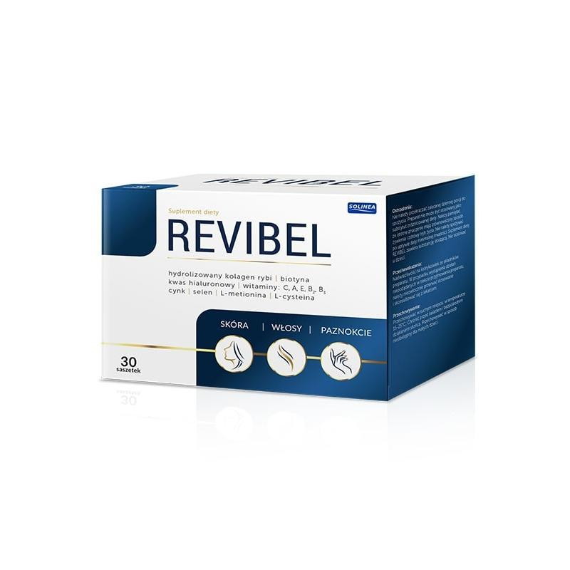 Revibel - to suplement diety w postaci saszetek, który zawiera hydrolizowany kolagen rybi, aminokwasy, kwas hialuronowy, witaminy oraz minerały. Produkt przeznaczony dla osób dorosłych.