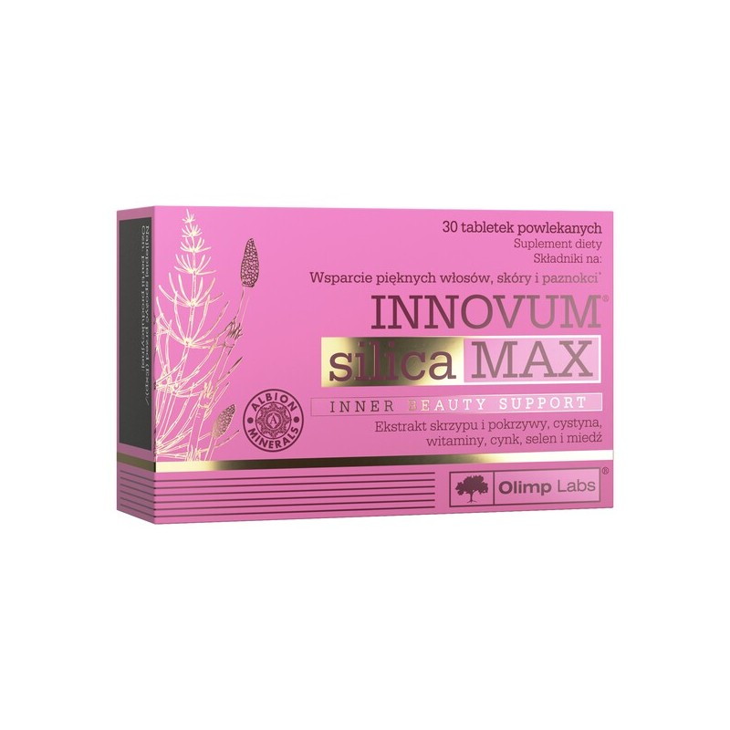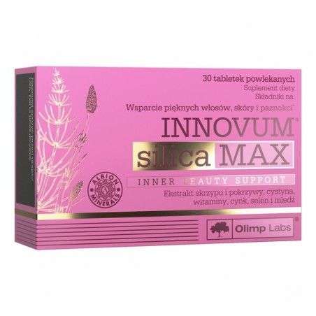 Innovum silica MAX - suplement diety zawierający wysoką porcję skrzypu polnego. Produkt przeznaczony dla osób dorosłych.