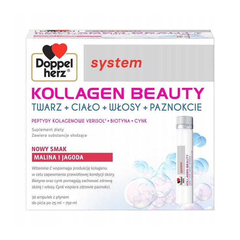 Doppelherz system Kollagen beauty to suplement polecany w celu uzupełnienia codziennej diety w kolagen. Powstał w formie wygodnej, gotowej bezpośrednio do picia ampułki o smaku malinowo- jagodowym. Suplement został stworzony z myślą o osobach, które chcą zachować zdrowy i piękny wygląd skóry, włosów oraz paznokci na jak najdłużej.