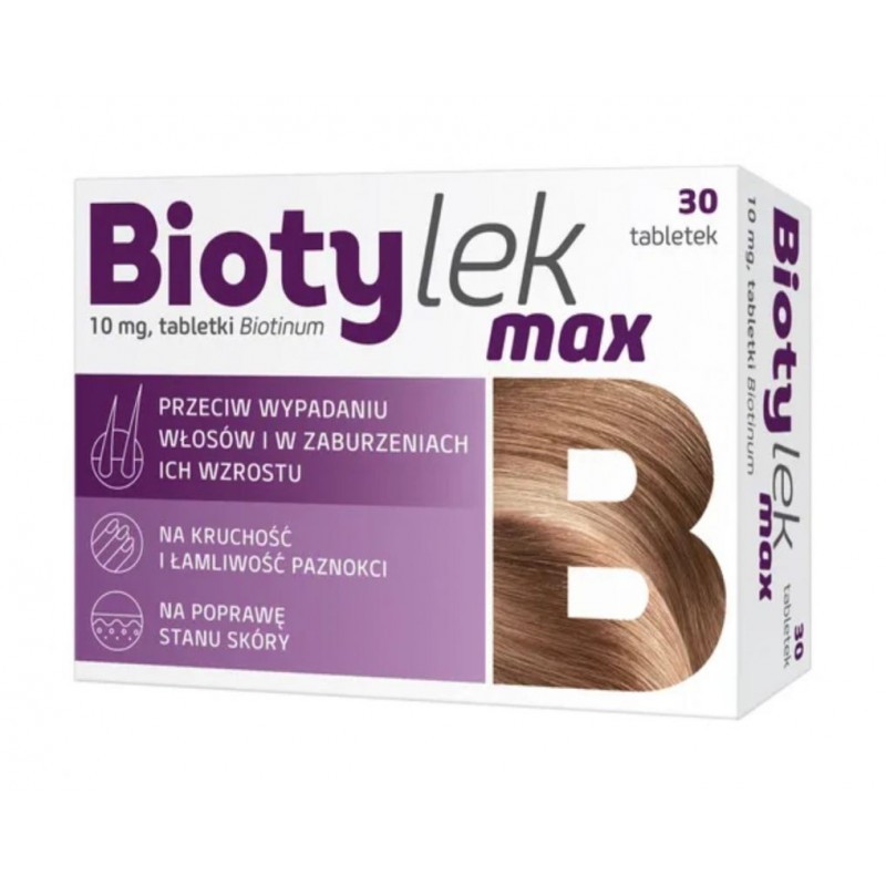 Biotylek Max to lek z grupy preparatów witaminowych, zwierający biotynę. Witamina wspiera procesy tworzenia kreatyny oraz różnicowania się komórek naskórka, włosów, a także paznokci, dzięki czemu poprawia ich stan. Biotylek Max stosuje się głównie w niedoborach biotyny, objawiające się m.in. nadmierną łamliwością i zaburzeniami wzrostu paznokci oraz włosów, jak również wypadaniem włosów, stanami zapalnymi skóry wokół nosa, ust, oczu, krocza.