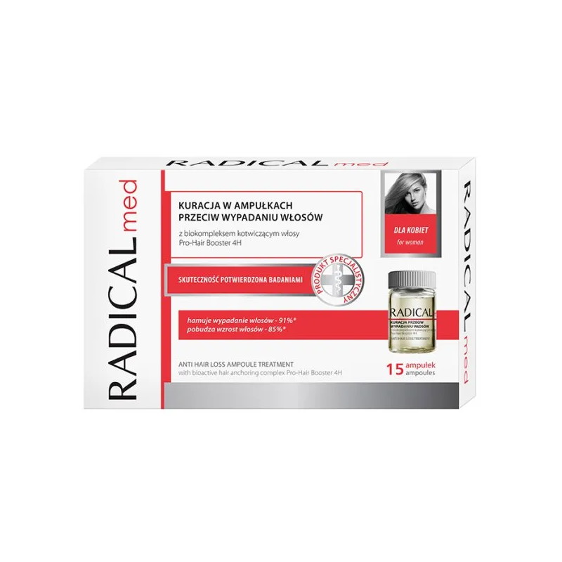 Kuracja przeciw wypadaniu włosów dla kobiet marki Radical Med to produkt kosmetyczny przeznaczony dla zniszczonych, wypadających i osłabionych pasm. Formuła zawiera: