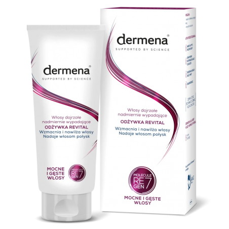 Odżywka Dermena Revital przeznaczona jest do pielęgnacji włosów dojrzałych, osłabionych, nadmiernie wypadających. Jej wzmacniająca formuła skutecznie poprawia kondycję włosów i przywraca im zdrowy wygląd. Ma działanie termoochronne. Zabezpiecza włosy przed przesuszeniem i wpływem niekorzystnych czynników zewnętrznych. Zawiera unikalny składnik aktywny pochodzenia witaminowego, wzmacniający mieszek włosowy i stymulujący odrastanie włosów - MOLECULE REGEN7.