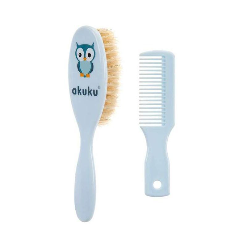 Szczotka i grzebień Akuku to zestaw uzupełniających się akcesoriów. Szczotka z naturalnym włosiem delikatnie czesze i masuje skórę głowy dziecka, nie elektryzując włosków. Grzebień z zaokrąglonymi końcówkami ząbków zapobiega podrażnieniom skóry głowy. To praktyczne rozwiązanie, dzięki któremu zadbasz o komfort i bezpieczeństwo malucha.