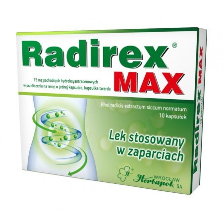 Radirex MAX to produkt leczniczy o działaniu przeczyszczającym do stosowania w sporadycznych zaparciach. Działanie Radirexu wynika z obecności pochodnych antracenowych - m.in. reiny.