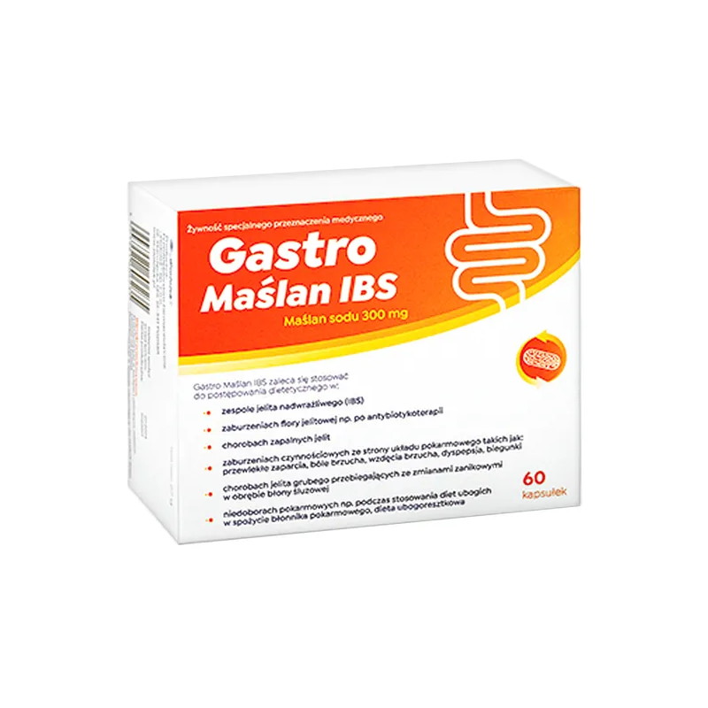 Gastro Maślan IBS – żywność specjalnego przeznaczenia medycznego. Dostarcza kwasu masłowego podczas jego zwiększonego zapotrzebowania powstałego w wyniku choroby lub ograniczeń błonnika w diecie.