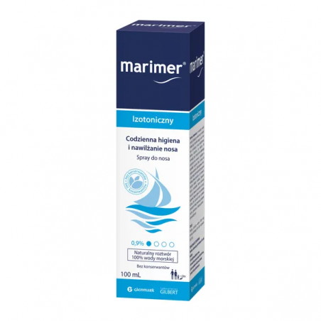 Woda morska Marimer spray izotoniczny to wyrób medyczny, który jest przeznaczony do codziennego oczyszczania jam nosowych niemowląt, dzieci oraz osób dorosłych. Spray stanowi fizjologiczny roztwór wody morskiej, naturalnie bogaty w sole mineralne i pochodzące z morza mikroelementy. Aplikator o starannie zaprojektowanym kształcie umożliwia bezpieczne stosowanie produktu u niemowląt. Wyrób może być używany codziennie nawet przez dłuższy czas.