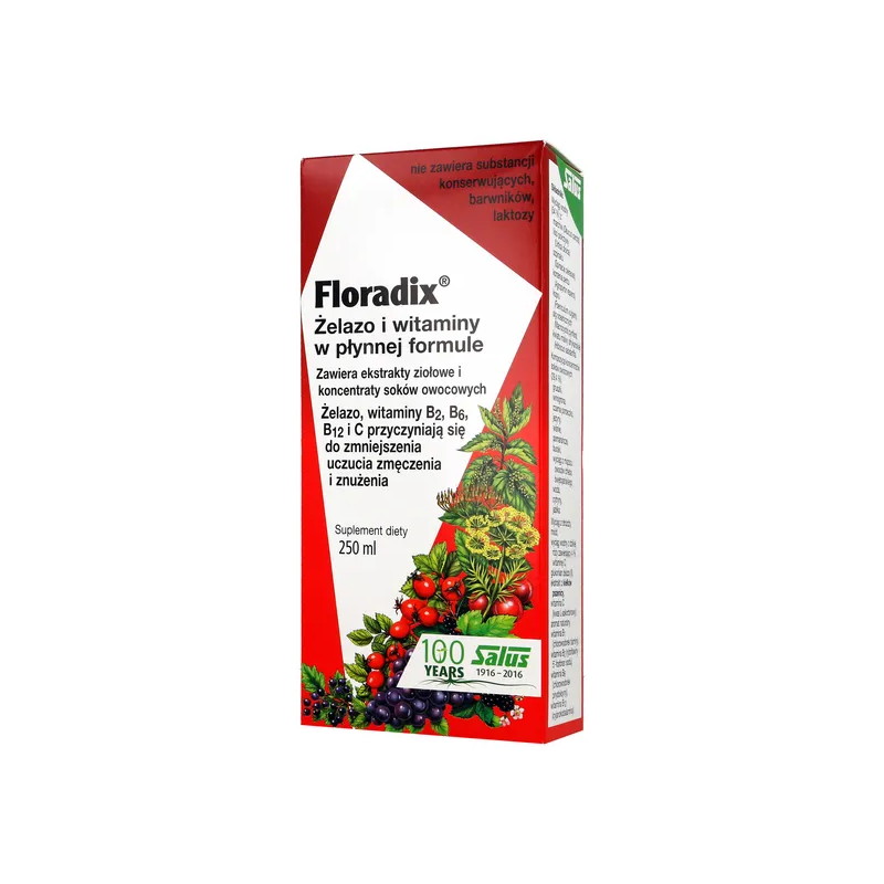 FLORADIX Żelazo i witaminy - suplement diety zawierający ekstrakty ziołowe i koncentraty soków owocowych. Produkt przeznaczony dla dzieci powyżej 12 roku życia i osób dorosłych.