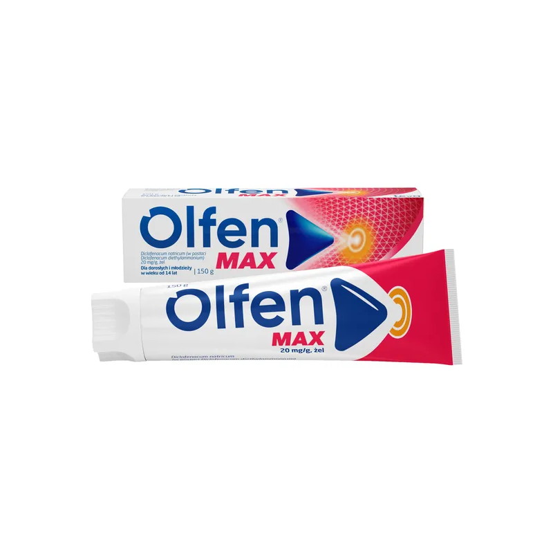 Żel Olfen Max to lek do stosowania na skórę o działaniu przeciwbólowym i przeciwzapalnym. Zawiera on diklofenak z grupy niesteroidowych leków przeciwzapalnych (NLPZ) i jest przeznaczony do objawowego leczenia miejscowego ostrych nadwyrężeń, stłuczeń czy skręceń. Olfen Max jest przeznaczony dla młodzieży w wieku powyżej 14 lat oraz osób dorosłych.