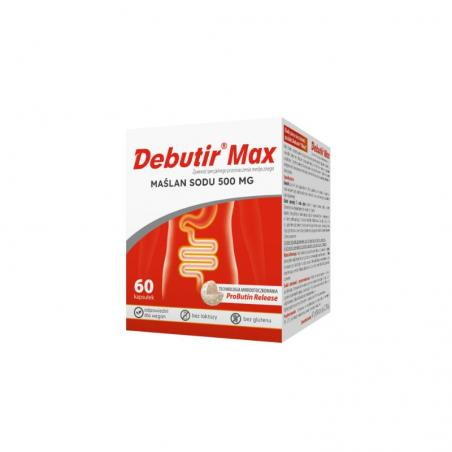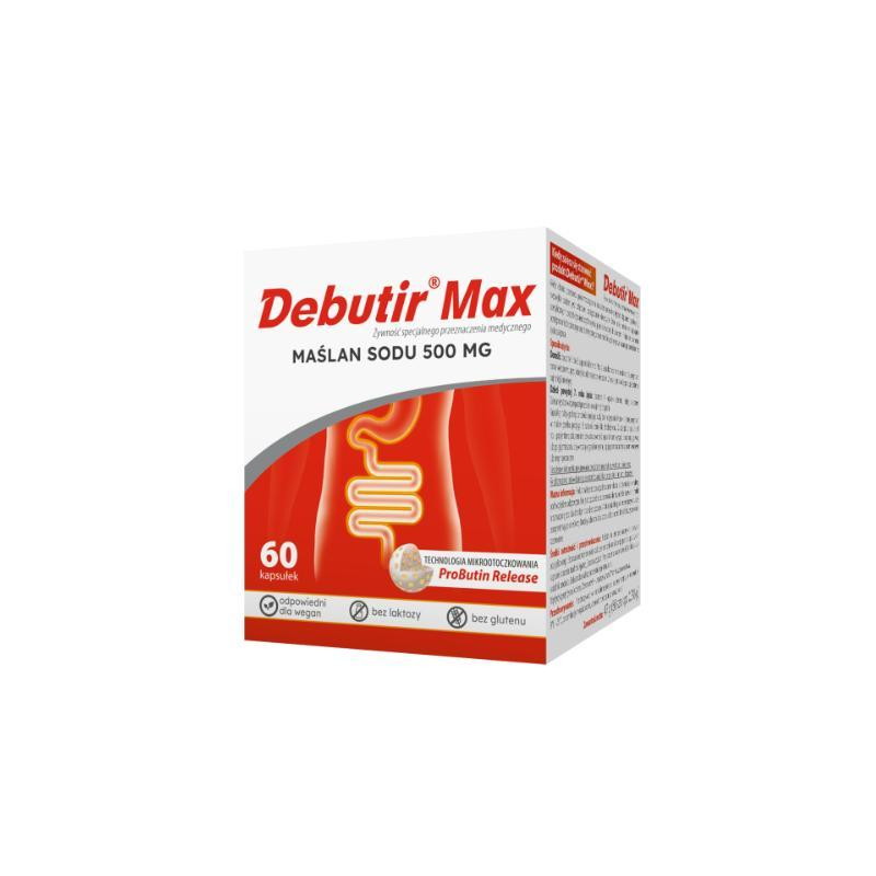 Debutir Max to żywność specjalnego przeznaczenia medycznego w kapsułkach, która zawiera sól sodową kwasu masłowego (maślan sodu). Produkt ma za zadanie wspierać odżywianie pacjentów z chorobami układu pokarmowego i odbudowę bariery jelitowej.