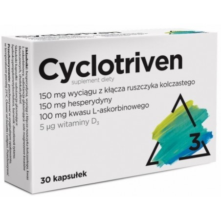 W opakowaniu znajduje się 30 kapsułek Cyclotriven. W skład każdej kapsułki tego suplementu diety wchodzi 150 mg wyciągu z kłącza ruszczyka kolczastego, 150 mg hesperydyny oraz 100 mg