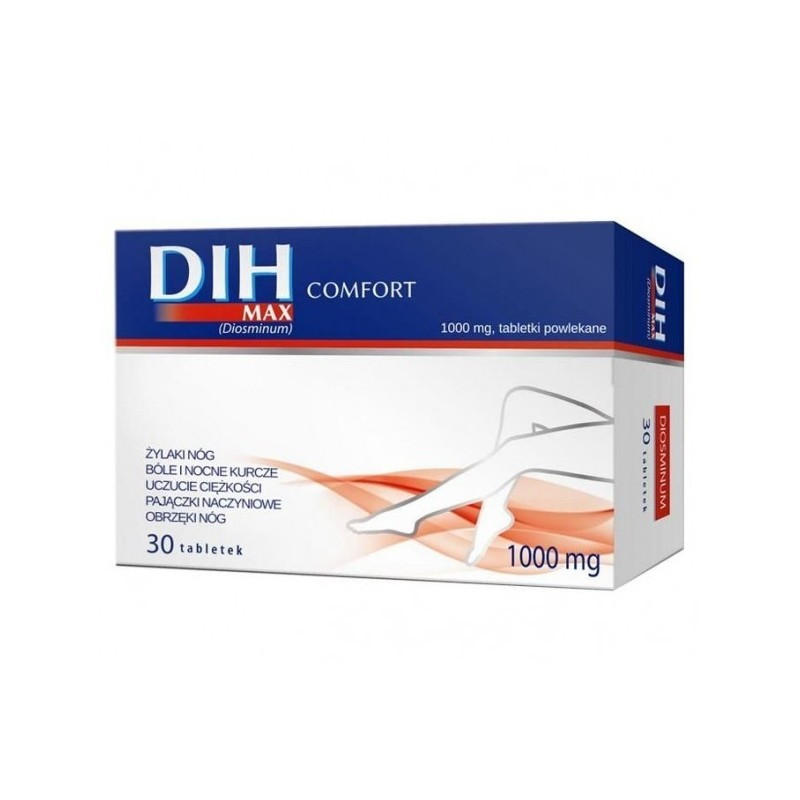 Lek DIH MAX COMFORT zawiera diosminę, która wykazuje działanie ochrone wobec naczyń żylnych. Zmniejsza ich przepuszczalność, zapewnia elastyczność i zwiększa napięcie ich ścian. Poprzez poprawę powrotu krwi z układu żylnego kończyn dolnych, zmniejsza nadciśnienie i zastój żylny w tych kończynach.