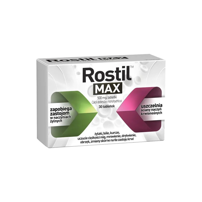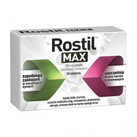 Rostil max to produkt leczniczy, który uszczelnia naczynia krwionośne i zwiększa ich elastyczność. Usprawnia krążenie żylne. Jest stosowany u osób dorosłych w objawowym leczeniu niewydolności żylnej nóg i odbytu (hemoroidów).
