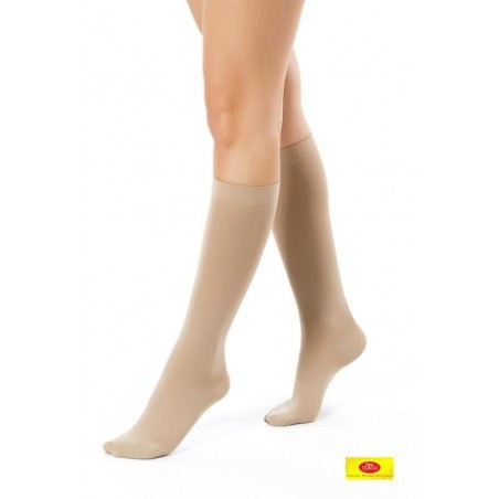 Podkolanówki medyczne uciskowe PANI TERESA – CCL 1, długie z czubkiem zamkniętym (w kolorze jasnobeżowym) należą do grupy produktów kompresyjnych – przeciwżylakowych stosowanych w profilaktyce i leczeniu żylaków kończyn dolnych. Specjalnie zaprojektowana konstrukcja wyrobów gwarantuje największy ucisk w okolicy stawu skokowego, słabnący zaś w kierunku łydki. Usprawnia to naturalne krążenie krwi w celu leczenia i profilaktyki chorób żył. Głównym bowiem celem jest profilaktyka i leczenie początkowych etapów choroby żylnej. Dzięki regularnemu noszeniu podkolanówek zmniejsza się nasilenie pierwszych objawów choroby. Dobór właściwego zestawu przędz (poliamid 78% i elastan 22%) oraz technologia produkcji zapewniają konieczne parametry uciskowe (15-21 mmHg) potwierdzone certyfikatami. Podkolanówki są przyjemne w dotyku, miękkie, elastyczne i doskonale przylegają do ciała. Spełniają obowiązujące standardy dla wyrobów będących w bezpośrednim kontakcie ze skórą. Oferowane są w dwóch (w pomiarze A – D) długościach: krótkie (34-37cm) i długie (38-44cm) oraz w dwóch wersjach wykończeń, z czubkiem otwartym (wolne palce) i zamkniętym. Gama kolorystyczna to: jasny beż, beż, ciemny beż, granat, grafit i czerń. Dostępne także w rozmiarach: S, M, L. Tabela rozmiarów: Oznaczenie Pomiar miejsca (cm) S M L XL pomiaru d obwód pod 27-34 32-40 36-43 40-49 kolanem obwód łydki c w najszerszym 29-35 34-41 37-45 42-48 miejscu obwód kostki b w najwęższym 19-21 22-24 25-27 28-31 miejscu Pomiary najlepiej wykonywać rano po nocnym spoczynku (w miejscach wskazanych w tabeli rozmiarów) mierząc zarówno prawą, jak i lewą nogę, gdyż mogą występować różnice w obwodach. Jedynie prawidłowe dobranie rozmiaru gwarantuje wartość leczniczą.Wskazane zastosowanie * narastający obrzęk w czasie dnia pracy* uczucie zmęczenia i ciężkości nóg odczuwane wieczorem* żylaki kończyn dolnych u rodziców, rodzeństwa* dziedziczne zaburzenia w zakresie układu krzepnięcia* pojawiające się tzw. pajączki żylne* po rozpoczęciu terapii hormonalnej (leki antykoncepcyjne lub hormonalna terapia zastępcza)* widoczne żyły na kończynie bez wyraźnego uwypuklenia nad skórę* obrzęki nóg i powiększające się żylaki u kobiet ciężarnychNie należy stosować przy miażdżycy tętnic kończyn dolnych, chorobie Buergera (tzw. „stopie cukrzycowej”).Zasady używania Nakładanie podkolanówek medycznych zaleca się rano (przed wstaniem z łóżka) w pozycji leżącej. Zakładanie należy rozpocząć od palców do kostki, rozprowadzając przy tym materiał równomiernie na stopie. Trzeba zwrócić uwagę na dokładne umieszczenie pięty. Po nałożeniu do kolana, dokładnie rozprowadzić na łydce zmniejszając nieco naprężenie wynikające z nakładania. Na koniec wygładzić wszystkie zgrubienia i zmarszczenia. Wcześniej, po zmierzeniu obwodu nogi w wybranych punktach określonych w tabeli rozmiarów, zmierzeniu wysokości A - D i wybraniu długości produktu, należy wybrać rozmiar korzystając z tabeli na opakowaniu. Prać ręcznie w wodzie o temp. 40oC przy użyciu delikatnych środków piorących. Nie dopuszczać do silnego zabrudzenia. Nie należy prasować, chlorować, wybielać i czyścić chemicznie. Suszyć w stanie rozłożonym z daleka od źródeł ciepła. Przechowywać w temperaturze pokojowej, w suchym i zacienionym miejscu. UwagiDobór rozmiaru i stosowanie podkolanówek medycznych uciskowych PANI TERESA - CCL 1 należy skonsultować z lekarzem. W razie wystąpienia ostrego bólu lub podrażnienia skóry trzeba zaprzestać noszenia i zgłosić to lekarzowi. Aby zapobiec przetarciom i uszkodzeniom produktu, należy pielęgnować pięty, nosić właściwe obuwie oraz pilnować, by nie zahaczyć podkolanówek czymś ostrym. Marka: PANI TERESA®Wyroby tej marki są przyjazne w użyciu i dają poczucie bezpieczeństwa. Spełniają wszelkie normy przewidziane dla profesjonalnej, medycznej kompresjoterapii, dzięki czemu umożliwiają szybszy powrót do zdrowia. Są komfortowe i wygodne w noszeniu. Posiadają przy tym najlepszą relację ceny do jakości.