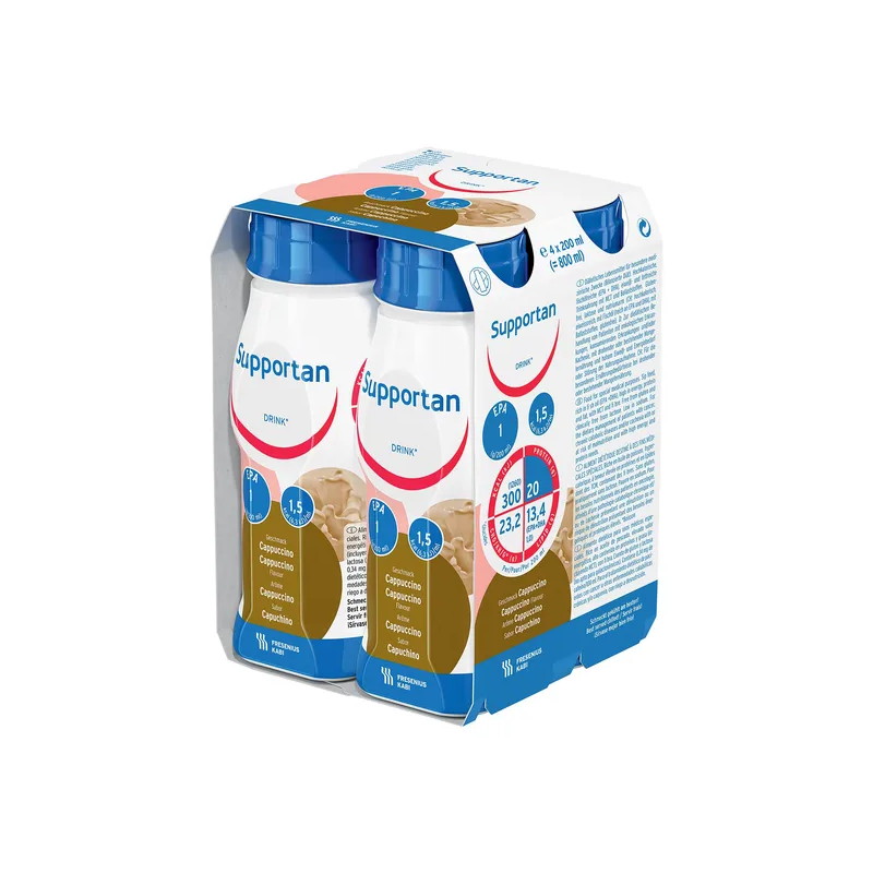 Supportan Drink Cappuccino, 4 x 200ml to żywność specjalnego przeznaczenia medycznego przeznaczona do postępowania dietetycznego u osób zagrożonych niedożywieniem lub niedożywionych, w szczególności z nowotworami, przewlekłymi chorobami katabolicznymi i/lub kacheksją.